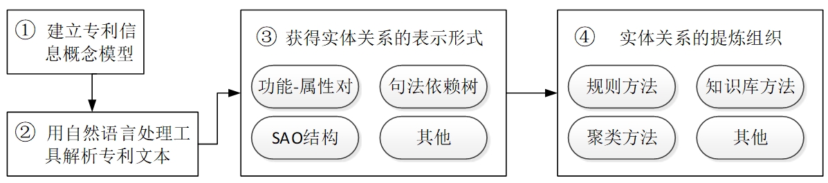 语义关系抽取旨在判断两个实体之间所存在的语义关系及其类型,按照语义关系的抽取对象范围不同,可分为句子级语义关系抽取、文档级语义关系抽取(或称句间语义关系抽取)以及语料库级语义关系抽取(LIU K, 2020)。目前专利挖掘中的语义关系抽取以句子级语义关系抽取为主,即从给定句子中识别实体之间的语义关系。由于这些方法以面向专利分析实际应用为主,具体方法多以流程形式呈现,内容较为繁碎,主要流程可概括如图2所示: